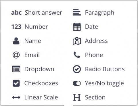 Forms allow you to get responses from the public. The image on the left shows form fields that can be added to a form. Analytics and export of form data is available. Cost items can be collected on form submit.