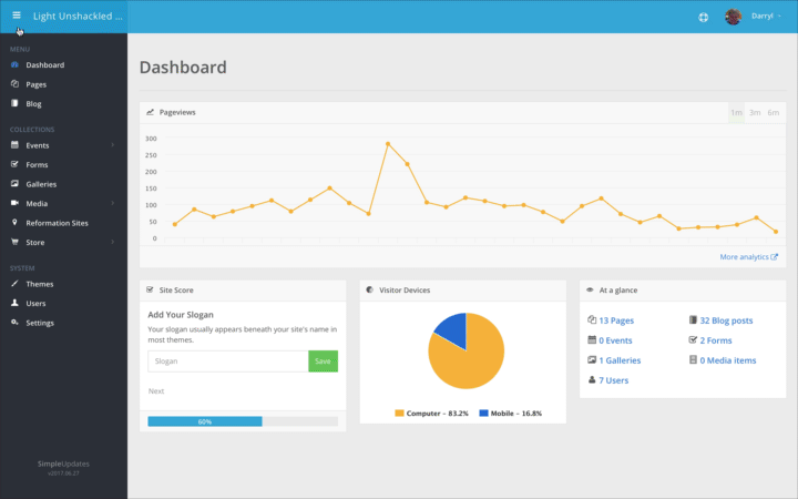 Pages is list of all the content pages of the site. Page titles link to the public view, and edit button will take you directly to edit a page.